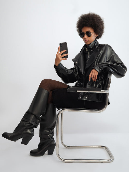 Layered Stand-Collar Faux Leather Fitted Jacket
