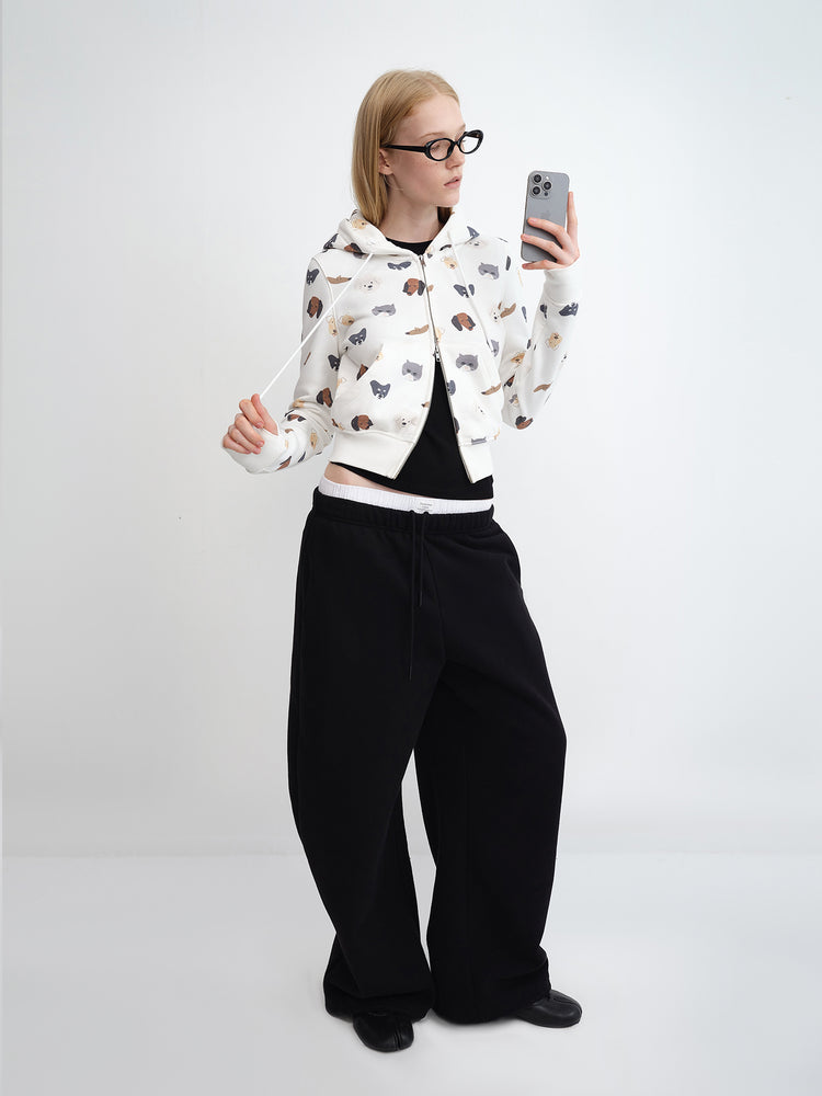 "Meow & Woof" Print Fleece Zip Hoodie